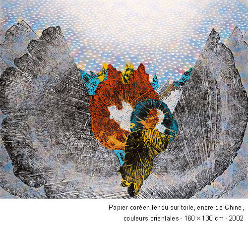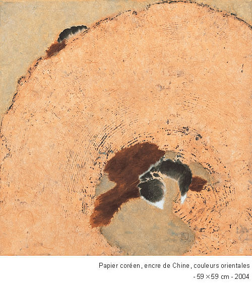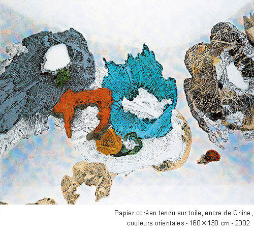나무의 물결치는 무늬로 가득 채워진 전면화 화면은 마치 앵포르멜의 표현을 연상시킨다. 공간을 의식하는 것이 아니라 그린다는 행위의 자적에 전체를 내맡기는 유형에 닮아있다. 물결치는 무늬는 찍어 낸 것이기는 하나 작가는 그것들을 꼴라쥬 해가면서 소용돌이치는 무늬속으로 자신을 던져 넣는다. 그 무수한 세월의 흔적 속에 자신을 던짐으로서 예기치 않은 만남의 충격을 획득해 나간다. 화면은 태초의 카오스를 연상시키는 거대한 물결 또는 기운들로 넘실거린다. 이 알수 없는 혼돈은 창조를 위한 예감으로 충만하다. 단편적이긴하나 구체적인 이미지를 보여주는 화면은 예컨대, 파도처럼 일렁이는 무수한 작은 돌기 속에 하얗게 들어난 길이나, 공중에 걸려 있는 줄에 매달려 있는 인간의 형상이나, 자전거를 타고 가는 인간의 모습들로 채워지는 것들이 지극히 암시적이긴 하나 지시적인 내용들임에 분명하다. 그의 화면 속에서 이토록 구체적인 영상이 등장하는 것은 90년대 후반부터이다. 분명히 드러난 하얀길이나 공간에 매달려 있는, 또는 자전거 페달을 열심히 밟고있는 인간의 실루엣은 다분히 관조적인 시각의 결정물처럼 보인다. 작가는 생을 되돌아볼만한 연령에 도달되어 있다. 자신의 삶에 대한 회한이 없을 수 없으며 자신이 걸어온 길에 대한 뿌듯한 감회가 일어나지 않을 수 없을 것이다. 굽이치는 많은 돌기 속에 뻗어있는 길은 어쩌면 자신이 걸어온 변화 속의 일관된 삶의 역정으로 볼 수 있을 것 같으며, 아슬아슬하게 줄타기하는 인간의 모습은 살얼음을 디디고 살아가는 보편적인 현대인의 자의식의 반영인지도 모른다. 그의 최근 작 가운데는 종이 꼴라쥬와 더불어 한지원료를 찢어 붙인 작품군이 새로운 시도로서 등장한다. 그것은 탁본에 의한 종이 꼴라쥬와는 다른 직접적인 물질의 첨가라는 점에서 꼴라쥬의 복합성을 드러내고 있다. 목리문을 탁본한 종이 꼴라쥬에 비해 한지의 원료 꼴라쥬는 구체적인 마티엘로서의 표현에 상응된다. 그만큼 화면은 풍부한 변화의 촉매로 넘쳐난다.