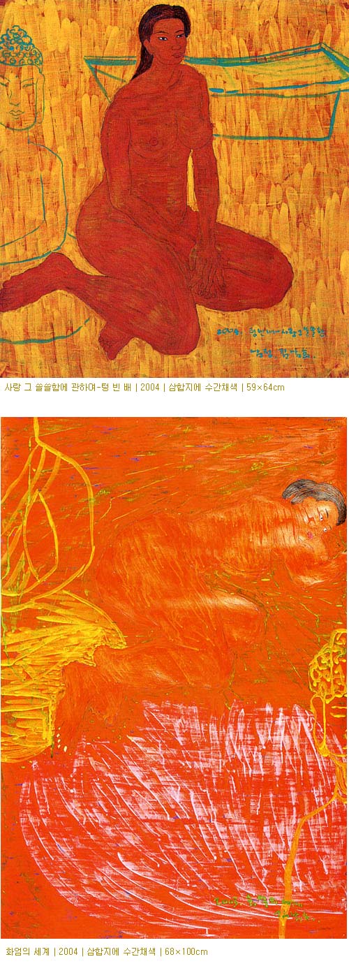 이제 한 단계 나아가 작가는 선을 긋고 또 그것을 깨는 작업을 시도한다. 푸르고 붉은 주황의 바탕 위에 그어진 파격의 선들은 곡선적인 이미지로 화면 속에 각인된 누드의 실루엣을 보다 강렬하게 받쳐주고 있다. 형상과 형상 없음, 즉 실(實 )과 허(虛)의 밀도에서 볼 때, 형상의 세계를 넘어서고자 하는 작가의 또다른 시도로도 읽혀진다. 이 또한 이념적인 측면에서 보자면, 그동안 불교적인 이미지에 갇혀있던 경직성을 풀어내고자 하는 의도도 내포되어 있는 듯하다. 요컨대 작가는 일관된 모티브를 천착하면서도 양식적인 면에서 나름의 변화를 추구하고 있음을 엿볼 수 있다.