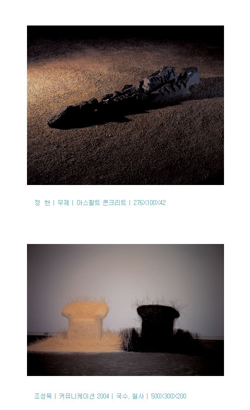 정현은 철로의 침목을 도끼와 전기톱으로 긁고 깍아내는 작업에서 최근에는 아스팔트콘크리트, ‘아스콘(ascon)'으로 만든 작품으로 새로운 변화를 시도했다. 파뒤집힌 채 버려진 아스콘 덩어리들의 우연한 형상과 재료와의 교감 속에서 이루어지는 그의 작업이 맞물려 미묘한 인체의 형상을 띄게 된다.