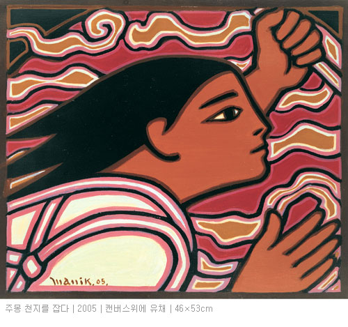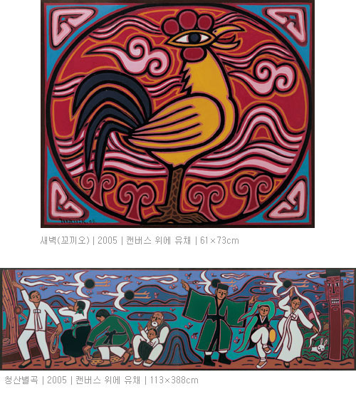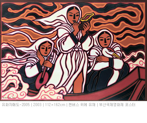 이번 전시에는 웅장하고 힘이 넘치는 아름다운 작품들이 출품되는데 역사적 신화를 배경으로 한 <유화자매도, 2003>, <주몽의 천기를 잡다, 2005>와 <명성황후, 1997>, <청산별곡, 2005> 등이 그것이다. 이 작품들은 힘찬 선과 강렬한 색채의 형태 배분으로 강한 메시지를 전달한다. 부산 국제영화제 포스터에 사용된 <유화자매도, 2003>는 고구려의 시조 주몽을 잉태한 유화부인과 그의 두 자매를 그린 것으로 힘과 에너지가 넘치는 작품이다. 거친 파도 위, 나무로 된 조각배 위에 당당하게 소라나팔을 불며 바람을 맞이하는 유화의 모습에서 고구려의 강한 정기인 고주몽의 잉태를 예견하는 강인한 영웅적 여성상을 읽을 수 있다. 이것은 중세의 아이콘화처럼 완전함과 완벽함, 균형과 조화, 광채와 색채를 추구하고 있다. 배경에 그려진 불꽃의 기운처럼 움직이는 공기는 앞으로 다가올 역경에도 불구하고 강하게 대처해 나아갈 범상치 않은 기운을 암시한다. 이것은 <주몽 천기를 잡다, 2005>에서 구체화되는데 이런 예사롭지 않은 천기를 손에 쥔 소년 주몽의 패기를 극대화한 작품이다.