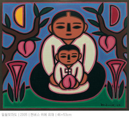 이번 개인전에서는 가족도, 역사, 설화의 3가지 주제로 작품을 살펴볼 수 있는데 이만익 특유의 서사적 감성이 소박하면서도 강한 형태로 그려진 것이다. 가족도는 자연의 서정적인 풍경이라는 상징적 배경 위에 단란한 가족을 도상적으로 그려낸 것들이다. 새순이 올라오고 꽃이 활짝 피는 화창한 봄날 머리 위에는 밥상을 이고 아이를 등에 업은 어머니와 봄꽃을 가득 딴 바구니를 어깨에 메고 그 위에 어린 딸을 목마태우고 있는 아버지 그리고 술병을 머리에 올린 소년이 등장하는 <가족나들이, 2004>는 단란한 네 식구가 가까운 자연으로 봄나들이 가는 정겨운 모습이다. <봄나들이, 2003>은 목련꽃이 피어있는 강가에 세 식구가 소풍을 나와 풍요로운 미래를 계획하는 듯 나란히 앉아있는 사랑스런 모습이다. 아이를 안고 있거나 아이와 함께 누워있는 따뜻하고 포근한 어머니의 모자도는 이만익이 즐겨 다루는 주제다. 아마도 그것은 어린 시절 이만익이 경험했던 좋은 추억들이며 지금은 찾아보기 힘들지만 영원히 간직해야 할 우리 민족만의 여유롭고 평안한 삶의 모습일 것이다.