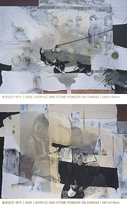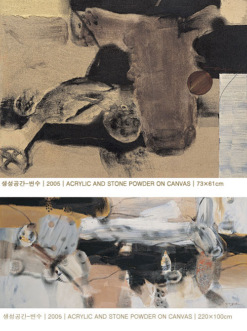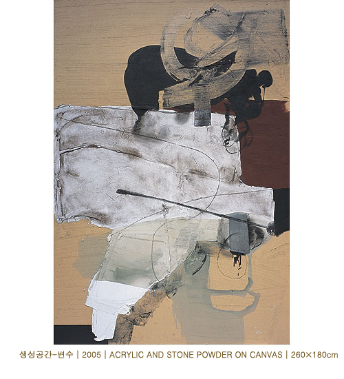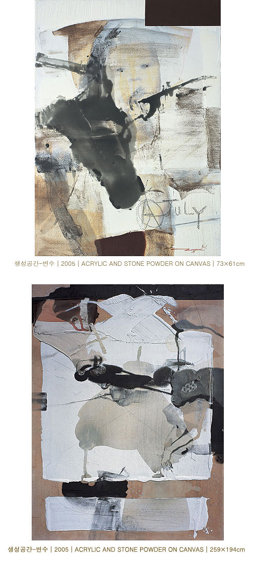 <생성공간-변수>에 등장하는 표현기호들은 숙련된 필치와 능숙한 순발력으로 질료들을 제압하는 힘과 폭발적인 에너지 그리고 스피디안 선묘의 결합에 의해 이룩된 총체적인 행위의 장이 되는데 일조하고 있을 뿐만 아니라, 시대적인 의식을 초월하여 과거와 현재 그리고 미래가 함께하는 초시간적인 공간을 장식하는 기능을 담고 있습니다. 여기에 등장하는 회색조와 블랙톤의 둔탁하고 날카로운 스트로크와 가느다랗고 부드러운 그림자들은 때로는 강하게 흩어져서 다시 모이기도하고 그것이 다시 다른 패턴에 의해서 새로운 질서를 구축하기도 합니다.