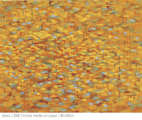 화면에는 일정한 크기의 원형(타원형)들의 구성이 이뤄내는 미묘한 균형과 긴장이 있다. 캔버스에 동그라미들이 첨가될 때마다 변화하는 긴장과 균형의 관계는 색에 의하여 수축, 팽창을 거듭 하면서 화면 전체가 모종의 에너지를 발산하게 한다. 그래서 색의 에너지에 의해 우리의 감각과 신체가 자연스럽게 감응한다. 저 안으로 은연중 빨려 들어가고 함께 흐르고 이동하고, 그리고 숱한 변화를 겪고 부침하고 넘나드는 순간들을 만난다.