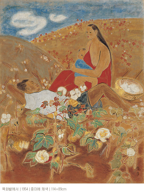 무엇보다 눈길을 끄는 작품은 세월을 50년이나 거슬러 올라간 1950년 초반의 작가일기 같은 미공개작들이다. 한복을 입은 새색시 시절의 고운 모습이 담긴 자화상 ‘단장’과 막내 쫑쫑이를 안고 아이 아빠와 단란한 나들이를 그린 ‘목화밭에서’ 등은 작가의 젊은 시절 화풍을 엿볼 수 있는 귀한 자료가 아닐 수 없다.