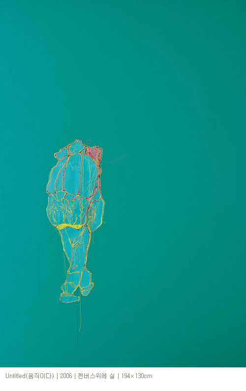 2. 가로지름, 감춤과 드러냄, 징후 프로젝트, 그리고 움직임...이 지점에서 1997년 미국 크랜브룩 미술대학원을 졸업하고 귀국한 이후, 권혁의 작품궤적을 살펴봄으로써 이번 전시의 큰 틀을 이해하는 실마리를 찾아보고자 한다. 권혁의 작품의 본령이 섬유미술이라는 지평에서 출발하고 있음은 의심의 여지가 없어 보인다. 적어도 형식적인 측면에서 그의 작품들은 섬유미술의 방법론에 의지하고 있음을 보여주고 있기 때문이다. 비닐에 재봉틀을 통한 스티칭(stitching) 기법을 새롭게 창출했던 그는 캔버스 천에 박음질하는 것으로 이어지고 있으며, 최근 들어서는 흰색 노방(老紡) 천을 캔버스에 그려진 화면을 감싸 속이 비치게 함으로써 이중적 이미지를 만들어내기도 한다. 여기서 특히 노방천은 섬유라는 일차적인 재료적 의미를 넘어서서 하나의 환영적 경계이자 이미지의 그물망으로써 작용하고 있다. 사실 노방천은 생사로 얇게 편직으로 짠 직물로서, 한자말 그대로 한다면 노인이 명주실을 뽑아 만든 비단으로 의상의 안감이나 속지에 많이 쓰이는 천이다. 전래적으로는 천연섬유인 실크로 만들어 졌지만, 최근에는 합성섬유로 만들어져 의상뿐 아니라 인테리어 등에도 많이 활용되고 있는 직물이다. 안이 살포시 비치는 이 노방은 한지와 같이 안과 밖의 환경을 완전히 차단하는 것이 아니라 상호 교류시키는 매개체로서 역할을 하게 된다. 다시 말하자면, 한지가 바깥의 환경을 고스란히 안으로 스며들게 함으로써 외계(外界)와의 대화를 가능케 한다는 측면에서 자연친화적이고 한국적 정서를 대변하는 상징적 재료였다는 사실이다. 이러한 한지처럼 노방 역시 전통적으로 여름철에 필요한 자연친화적인 소재였다. 한지가 건축 속에서 한국적 정서를 반영해 왔다면, 노방은 인체를 대상으로 한국적 미의 한 전형을 표출했다고 할 수 있다. 노방은 주로 여름철 의상의 소재로 쓰여져 몸과 옷 사이에서 공기의 순환을 도왔을 뿐만 아니라 신비스런 안의 자태를 보일 듯 말듯 비추게 하는 매혹적인 직물이었던 것이다. 노방은 이런 측면에서 직설적인 노출이나 외부와의 완전한 절연이 아닌 미망(未忘)을 간직한 은유의 창이었던 것이며, 욕망의 실체 너머를 들여다보고 싶도록 유인하는 미혹(迷惑)의 경계였던 것이다. 이러한 맥락에서 권혁이 캔버스에 일차적으로 그려진 이미지를 안이 비치는 노방 천으로 한 겹 덮음으로써 구획화 내지 이면(裏面)화시킨 태도는 질 들뢰즈(Gilles Deleuze)와 펠릭스 가타리(Félix Guattari)가 언급했던 것처럼 욕망의 진정한 대상에 도달하는 것이 불가능한 상태로서 ‘기쁨의 결핍’과 일정부분 관련을 맺고 있다고 볼 수 있다.