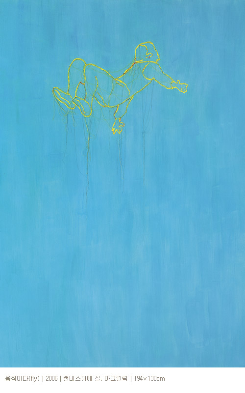 결국 권혁의 의도한 움직임이라고 하는 명제는 “나는 생각한다. 고로 존재한다(cogito, ergo sum)”는 데카르트(Descartes)의 진술 속에 합류되면서 존재론적 질문으로 환원되는 것이 아닌가 싶다. 세 번째 유형은 길을 떠나는 사람의 형상이나 공중에 붕 뜬 상태의 사람의 형상을 스티칭 기법으로 캔버스에 사실적으로 묘사한 작품들이다. 대체로 단일한 색조의 바탕 위에 박음질된 공중에 떠있는 사람의 형상이나 여행자의 모습들은 뒷모습이거나 옆모습이다. 그리고 이들의 형상은 각기 바탕 색면의 변주 외에는 배경이나 원근법적 구도 등이 배제되어 있다. 무중력의 공간 속에 놓여있는 듯한 이들의 모습에서 우리는 오히려 무한한 영토를 향한 끝없는 유랑의 시선을 발견하게 된다. 길 떠나는 이들의 무거운 짐과 얼굴없는 표정에서 현실 저편의 피안의 세계를 찾아, 억압과 욕망의 구조로부터 벗어나려는 또 다른 욕망의 무게를 만나는 것은 그리 어렵지 않다. 이 세 번째 유형은 앞의 유형들과는 다르게 개인적이고 내면적인 사유를 보다 단순하고 분명한 어조로 표명하고 있다고 하겠다. 몽상가의 아침처럼, 권혁의 길 떠난 사람이나 공중에 떠 있는 사람의 형상에 담긴 움직임의 문제는 너무나 시린 빛깔 속에서 구현되고 있다. 현상적으로는 화면 속에 정지되어 있지만, 의미론적으로는 움직임이 내재되어 있는 화면 속에서 권혁이 탐색하고 있는 움직임의 문제는 이처럼 서로 다른 유형의 작품들이 혼성적으로 조합된 가운데 제시되고 있다. 그러나 형식적인 측면에서 일관성이 없는 듯한 혼성적인 작품경향 역시 권혁의 조형의식이 포스트모던의 미학에 기초하여 지극히 다층적이고 불확정적이라는 사실을 읽게 해주는 점이 아닐 수 없다. 이러한 다층적인 형식탐구를 관통하고 있는 그의 일관된 움직임에 관한 철학적 사유들 속에서 우리는 고정적인 관념의 지평을 넘어서고자 새로운 경계선상에서 끝없이 동요하고 있는 한 예술가의 눈빛을 목격하게 된다. 적어도 권혁이 자신의 조형적 탐색을 모더니즘의 유기체적 구조에서 독립시켜 나가면서 섬유미술, 회화, 설치, 영상등과 같은 매체의 자유로운 접합을 통해 새로운 영토를 개척해 나가고 있음은 그의 미래적 전도를 내다보게 하는 분명한 지표가 아닐까. 욕망하는 것들의 존재론적 성찰을 지속해 나가고 있는 그의 유목적 여행에서 나는 경계위의 예술가가 연주하는 새로운 조형적 음률을 듣고 있다.(*)