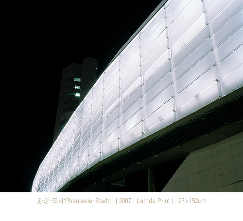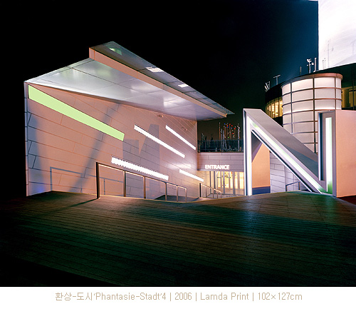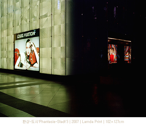 이익재의 야경 사진들도 다르지 않다. 그곳이 이벤트를 위해서 지어진 조형물이든 영화를 보거나 쇼핑을 위해 우리가 찾아가는 메가 복스의 실내 풍경과 루비똥 백화점의 외부 풍경이든 이익재의 사진 프레임 안에 들어 있는 공간들은 모두가 시장 공간들이다. 그 공간들의 주인은 상품들이며 우리는 그 공간 안에서 다만 소비 주체로서의 역할만을 지닐 수 있을 뿐이다. 하지만 보다 중요한 건 이 공간들이 상품들과 우리들 사이의 도치된 주인-하인의 관계를 미처 깨닫지 못하도록 장치화 된 공간, 즉 판타스마고리의 공간이라는 사실이다. 다시 말해서 이 공간들은 모두가 밤이라는 자연의 몸 안에 인공광과 인공색을 수혈하여 만들어진 일종의 사이비 자연 공간이며 기술적으로 재창조된 그러한 사이비 자연성 때문에 우리는 그 안에서 일어나는 모든 일들을 마치 자연 현상인 것처럼 받아들이는 현혹상태에 빠져드는 것이다. 그러한 현혹관계를 깨닫는 일은 쉽지 않다. 실제 공간을 본래의 콘텍스트로부터 분절한 다음 빛과 색의 디지털 리터칭을 통해 개개의 공간들을 보다 환상적으로 재구성하는 이익재의 야경 사진들은 대도시 공간의 판타스마고라적 성격을 역설적으로 드러내기 위한 사진적 전략일 것이다.