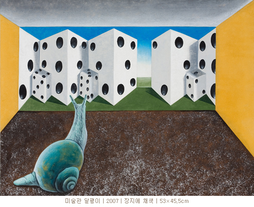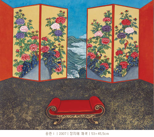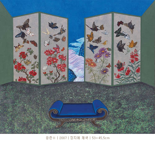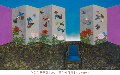 외국 여행에서 다양한 형태의 이국적인 의자에 집중해왔다. 그녀가 화면에 도입한 의자는 작가 또는 누구라고 딱히 지칭할 수 없는 존재의 암시로 볼 수 있으며 그 존재가 처한 현재의 상황을 암시한다. 그리하여 그 존재는 화면 속에서 과거와 현재를 연계하며 작가의 창작의욕과 창작환경의 현실적 제약에서 오는 괴리, 전통과 현대를 조화롭게 접합하려는 노력과 화려한 표현력을 억제하지 못하는 태생적 기질과 감수성. 이 모든 것을 담아내기에 다소 버거운 듯 화면 안에서 아담하게 자리 잡고 있다.