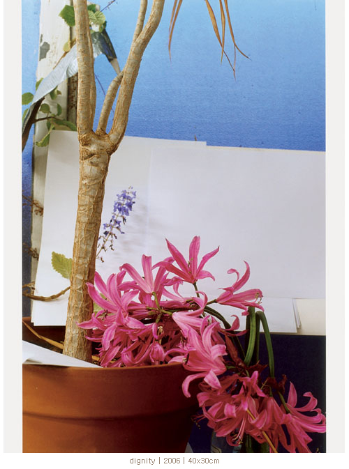 A:정물은 일반적인 세계에서 떨어져 나온 소우주와 같습니다. 정물작업이 시작된 곳은 나의 세계입니다. 모든 정물들은 완전히 내가 구상해낸 것은 아닙니다. 어떠한 연출과 발견된 것들을 결합한 것입니다. 그것은 하나의 오브제로서 창턱 위나 마룻바닥 위 아니면 테이블 위에 만들어진 것이죠. 이러한 사물들은 나의 삶을, 나의 세계를 이야기 합니다. 이미 지나간 과거의 전기적인 도킹지점만으로 이해되는 것이 아니죠. 그것들은 물론 아주 보편적으로 읽혀질 수 있는 하나의 오브제(사물) 입니다.