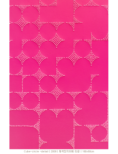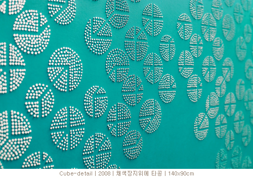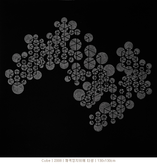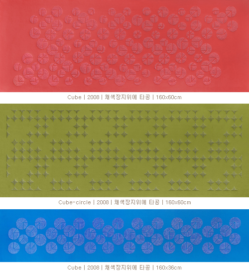 종이 위에 일정한 형식을 가지고 구멍을 뚫어 그 형태들로 단순화와 반복을 통해 제2의 이미지를 만든다. 반복적인 타공 행위에서 오는 일종의 무위 상태는 새로운 시각의 계기가 되었으며 이를 통해 만들어내는 '큐브'라는 주제가 갖는 기묘한 공간감처럼 작가의 작품 역시 단순히 평면으로 그치는 것이 아니라 뚫린 공간 뒤쪽으로 새로운 공간이 확장되어 보는 이의 자유로운 해석을 유도한다.