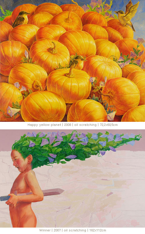 이종근은 평범하고 친근한 사물로부터 이 세계를 구성하는 본질적인 부분들을 탐구한다. 같은 모양처럼 보이는 호박은 우리의 모습과 닮아있다. 호박하나마다 껍질과 알맹이 그리고 성격이 다르게 보인다. 그것의 본질적 요소를 생각하며 하나씩 만들어가는 이종근의 표현법이다. 자연에서 누렇게 완숙된 형태로 익어가는 호박에게는 그 나름대로의 시련이 있었을 것이다. 비바람, 벌레와 많은 고난과 시련 끝에 하나의 결실을 맺은 모습이다. 그 안에는 표현뿐만 아니라 간절한 기원도 포함된다. 이종근의 작업을 좀 더 가까이 다가가 자세히 들여다보면 모두 날카롭고 가는 선으로 물감이 긁혀 표현된 것이다. 섬세한 에칭 판화기법과 회화의 터치가 접목된 그만의 독특한 테크닉이다. 물감으로 색을 칠하고 적당히 말랐을 때 날카로운 칼로 밑에 색깔들을 긁어 채도와 음영을 만들어낸다. 마치 연필로 데생한 것 같은 보기에는 아주 편안하지만 한 터치씩 표현하게 되는 장기간의 시간이 필요한 작업이다. 마치 하나의 호박을, 수국을 나팔꽃을 피우기 위한 생명의 산고처럼 말이다. 이종근은 평범한 사무용 칼로 작업한다. 그것은 매우 날카롭고 뾰쪽하여 섬세한 터치의 마티에르를 만들어낼 수 있다. 무뎌지면 곧바로 끊어 새날을 얻게 되는데 그는 사용한 칼날들은 병에 가득 모아 놓았다. 이 병에 모인 칼날들은 비록 드러나지 않지만 그의 작업을 이해하기 위해서는 이것은 매우 중요한 의미를 지니고 있다. 모든 것은 양면성이 존재하는 것처럼 편안하면서도 기분 좋은 이종근의 그림이 있기까지는 작가의 시간과 노력, 힘과 고통으로 상징될 수 있는 날카로운 칼날들이 잔뜩 쌓여 있어야만 했다. 그 안에는 같은 일을 반복하는 초월의 의미가 있고 질료로 싸워 이상적 형태를 만들어보고자 하는 이종근의 작가정신도 있다. 그리고 무엇보다도 모든 이들의 행복과 건강을 바라는 개인적인 소망이 묻어있다. 이것은 그의 개인사와 관련이 있는데 아토피를 앓고 있는 그의 어린 아들을 매일 긁어 주면서 낫기를 바라는 마음의 표현 작업이다. 아토피는 그렇게 큰 병은 아닐지 모르나 가려워 괴로워하는 어린 아들과 그것을 바라보는 부모에게는 많은 고통을 주는 그런 것이다.
