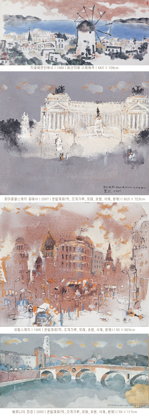 그의 근작은, 그의 말대로 경쾌한 스케치 풍경들이 중심을 이룬다. 여행을 통해 얻어진 이국적 풍경 등이다. 중국 계림의 산악 풍경을 비롯해서 로마, 피렌체, 파리 런던, 프라하 등 서양의 도시풍경 등이다. 이들 풍경들은 이곳을 여행해본 경험이 있는 사람들에겐 아늑하면서도 감미로운 한 때의 기억을 되살리게 한다. 아직도 이곳들을 가보지 못한 이들에겐 이국적 취향에 잠시나마 젖어 마치 현장에라도 온 것 같은 느낌을 안겨준다.