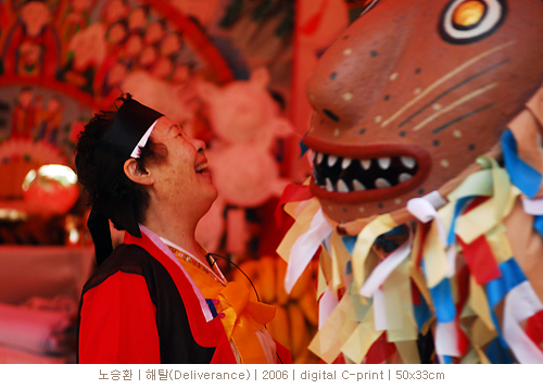 그녀가 하늘을 향해 힘차게 내뻗은 오방색 천이 허공을 휘익 휘젓고 돌아온다. 그녀의 신을 위무(慰撫)하는 것이 그녀의 임무다. 그녀의 기구한 현세의 팔자 혹은 운명은 그녀를 무당으로 내몰았다. 그 운명은 거부할 수도 없었다. 그렇다고 선택할 수 있는 것도 아니었다. 희랍신화의 시지프스(Sisyphus)의 운명 같은 그녀의 운명은 고래의 뱃속에 삼켜졌다가 살아난 구약성경의 요나(Jonah)에도 비할 바 없이 가혹하다. 그럼에도 불구하고 춤추는(舞) 그녀는 비워지지 않는 자신을 비워야(無)한다. 그래서 작가는 하늘을 향해 내던진 오방색 천의 다이내믹을 사진의 중심에 두고, 슬픈 운명의 무당얼굴을 슬그머니 오른 쪽 구석으로 밀어낸다.