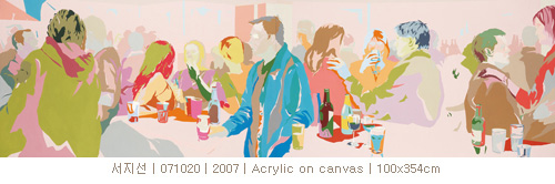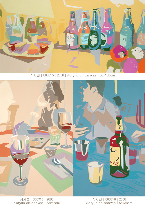 서지선의 작업은 일상의 단면을 사진으로 기록하고 이미지의 실루엣을 화려한 색의 패턴으로 화면에 배치하여 보여준다. 작가는 이미지를 평면화시키기 위해 종이를 잘라 붙여 놓은 듯한 깔끔한 색면의 처리와 절제된 듯하나 생동감 있는 색으로 실루엣을 패턴화 시킨다. 그녀의 작품 제목은 관계가 형성된 그날의 일기를 쓰듯 <071020, 080515>처럼 모두 날짜이다. 작가의 눈에 포착된 술병과 술잔, 커피잔과 케이크접시들… 일상 속에서 너무나 사소하게 존재하는 것들 이라서 일까? 많고 많은 것들 중 왜 그것들에 작가의 눈과 손이 가는지 궁금증을 자아낸다. 그 이유를 미루어보건대 아마도 기억해야 할 만남의 자리에선 늘 관계를 융화시키는 매개체로 커피나 술이 등장하기 마련인 것처럼, 어색한 사이라도 서로 주거니 받거니 오가는 한 모금의 술잔 속에 담긴 마음은 그림을 통해 대중과 소통하고픈 작가 자신의 바램이기도 한 듯 하다. 상대가 누가되었든 그것은 중요하지 않다. 그보다 얼마나 가치 있는 만남으로 우리의 마음이 풋풋한 파스텔 톤으로 물 들었는지 기억될 뿐 이다.