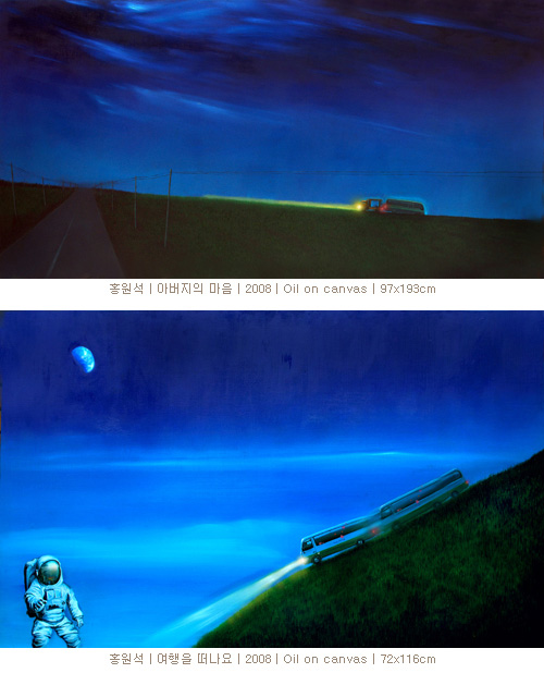 홍원석은 유년기 시절 아버지가 운전하시던 택시를 통해 바라본 세상과 군 복무시절 엠뷸런스 운전을 하면서 직면했던 긴박한 순간들, 그리고 일상의 스쳐 지나가는 잔상들이 합쳐진 순간을 담아낸다. 이번 전시에서 보여주는 그의 근작은 이전의 작업들과 달리 본인의 마음을 보다 적극적으로 드러내려는 시도를 하고 있다. <여행을 떠나요>, <아버지의 마음>은 작가 개인의 이야기이기도 하지만 모두의 이야기이기도 하다. 관광버스는 젊은 예술가로서 주어진 기회들에 안전하게 몸담아 여행하며 행복을 느꼈던 자신이면서 동시에 현실에 안주하지 않고 보다 깊이 있는 작업을 위해 스스로를 벼랑길로 내던지듯 채찍질 하는 또 다른 자신이다. 자신의 몸보다 더 큰 덩치의 버스를 어두운 밤하늘 한줄기 불빛을 쏘며 힘겹게 이끌어가는 견인차는 가장으로서 힘겨운 삶을 살아가는 애처로운 아버지의 모습이다. 현실 속에서 '운전運轉'이라는 행위를 통해 자연스럽게 삶을 바라보게 된 작가는 이제 자신의 그림 안에서 가상의 Art-Driver(예술운전사)가 되어 기억의 파편을 따라 이리저리 자유롭게 여행하는 동시에 밝은 미래를 꿈꾸며 힘차게 달린다.