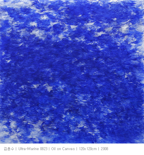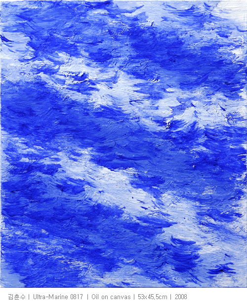 그 맥락에 비추어 작품들은 단순한 형상성이 무한한 의미지층으로 쌓여갈 수 있다는 가능성을 보여준다. 단순한 색명으로서 울트라마린을 이해했다면, 인식의 첫 관문을 연 것이고, 요동치는 색채의 흐름과 운동을 보고서 바다까지 연상했다면 두 번째 사유과정을 지나친 것이다. 마지막으로 형상사유의 동선이 바다를 떠나 무한의 공간과 그 속을 채우고 있는 푸른 기운에 다다르고, 또한 이것이 작가의 조형의지가 보여주려는 초월적 시각현상이라고 결론을 내린 후 작품은 비로소 숭고의 지평을 열어준다. 하지만 그렇다고 작품명이 이러한 목적론적 의미만을 내포했다고 단정하기에는 이르다. 제목이 작가가 유일하게 사용한 색이라는 사고의 원점으로 되돌아오면, 사유의 지도는 다시 그려질 수 있다. 이렇듯 김춘수의 파란 화면은, 이전 다니엘 뷔랭(Daniel Buren)이 단순히 반복되는 수직선 하나로 여러 정황(context)과 환경 속에 다양하게 재해석될 수 있는 형상작업을 유도해 낸 것에 비교될 수 있다. 하지만 뷔랭이 외부와 관련해 형상의 다양성을 찾았다면, 김춘수는 관객 내면에서 생성되는 사유의 다양성을 가져다주는 그런 이미지를 생산해 냈다.