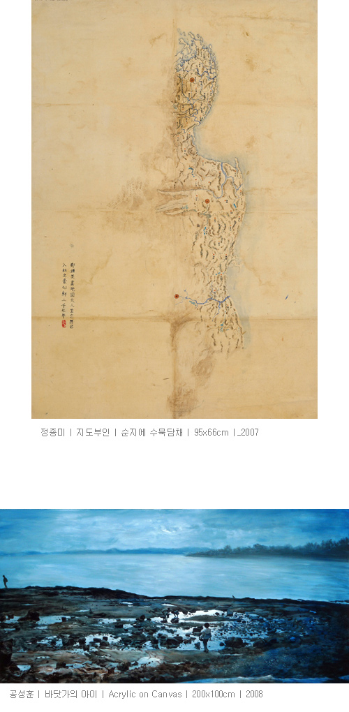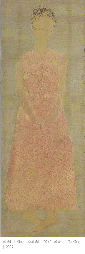 그러므로 정종미 작가에게 색은 무엇보다 물질과 정서가 만나는 지점이다. 그런 탓인지 작가가 생각하는 색은 때론 치밀한 과학적 분석을 요구하는 그런 대상이기도 하고, 때론 명주 천에 베어 나오는 슬픔과도 같다. 은은한 배색 위에 올려놓은 여인들의 형상은 작가가 바라본 역사와 현재 속에 살아있는 여성성을 보여준다. 작가의 유전자 깊숙이 각인된 이 여성성은 그가 만지는 재료에서도 묻어난다. 다양한 한지나 천을 사용하는 것에서는 특이하다고 할 수 없지만, 그 재료가 내용과 불가결한 관계를 맺고 있다는 점에서, 즉 단순한 시각적 매체 따위로 치부할 수 없다는 점과 그 자체가 여성성을 표현하는 조형언어라는 점에서 괄호를 칠 대상이 된다. <종이부인>이니, <지도부인>과 같은 제목들이 작품에 부기되어있으며, 보다 서정적이고 서사적인 제목을 기대했던 필자의 기대에는 비껴갔지만, 그 나름대로의 이유를 이제야 찾을 수 있을 것 같다.