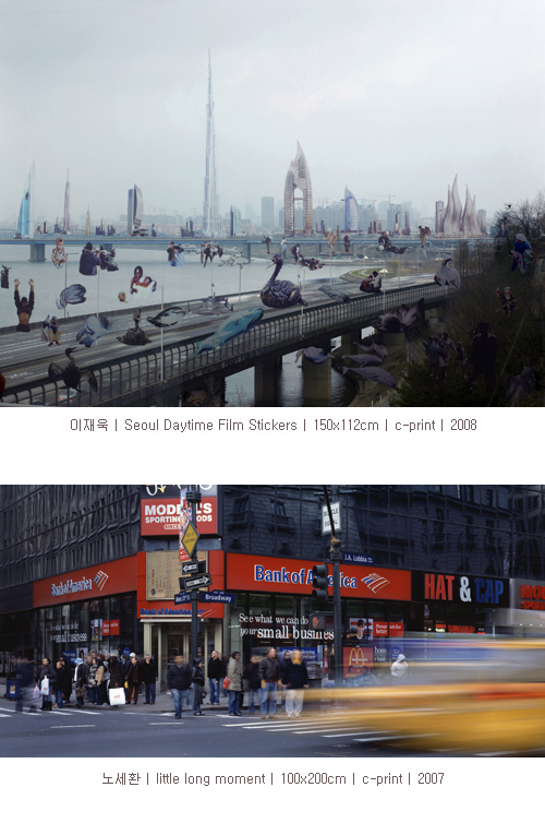 또한 대형건물의 창에 스티커 작업을 한 후 내부에서 촬영을 하여 바깥세상과 오버랩 시키고 있는 이재욱의 사진과, 면천에 수묵으로 현대 도시인들이 욕망하는 자동차, 샹들리에, 보석 등 시리즈 작업을 해온 장재록의 수묵화, 그리고 회화과 출신의 사진가 주도양의 우주와 같이 둥근 다시점 사진 시리즈를 선보일 예정입니다.