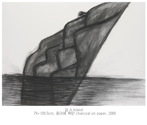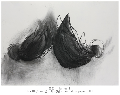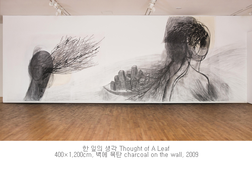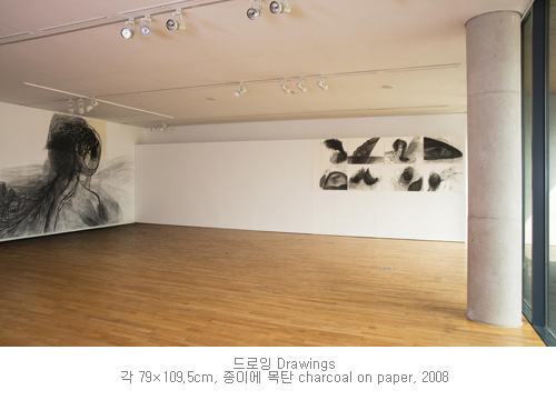 드로잉은 생각을 신속하게 표현할 수 있고, 다듬어지지 않은, 날 것의 거칠고 생생한 느낌이 살아있다. 특히 목탄을 매체로 벽과 종이에 그림을 그리는데, 목탄은 손으로 문지르고 지우는 신체와의 직접적인 만남이 있고, 그래서 더욱 섬세하고 내밀한 생각의 흐름을 표현하기에 적합하다. 그렸다가 지우고 또 그리는 과정이 그대로 쌓여, 작품은 깊이를 더해간다. 작은 종이에서 벽으로, 목탄의 그음은 공간으로 확장된다. 큰 벽에 드로잉을 하고, 나중에는 지워서 사라지게 하는데, 특정 공간에만 가능한 ‘여기’에 관한 기록이며, 지움을 통한 사라짐의 의미는 영원하지 않은 현재, ‘지금’에 대한 강조이다. ……