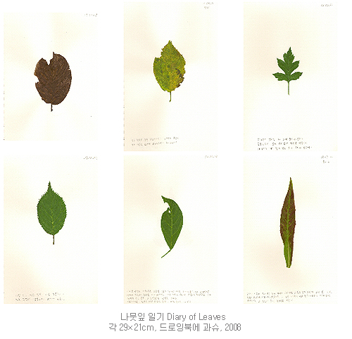 작업실 근처의 북악산 산책을 즐겨하면서 이 작업은 시작되었다. 매일 주워온 나뭇잎을 붙이고, 그 크기와 빛깔과 똑같이 그린다. 산책하면서의 사색을 짧은 글로 쓴다. 시간이 지남에 따라 붙여진 실제의 나뭇잎은 변색되고 말라간다. 하지만 그려진 나뭇잎은 생생한 순간의 빛을 간직하고 있다. 이 작업은 봄부터 시작되어 지금도 매일 한 장씩 계속되고 있고, ……