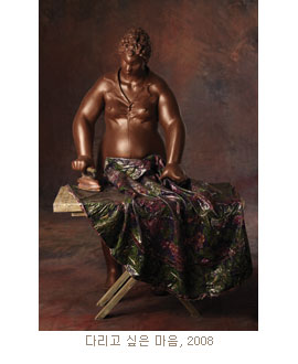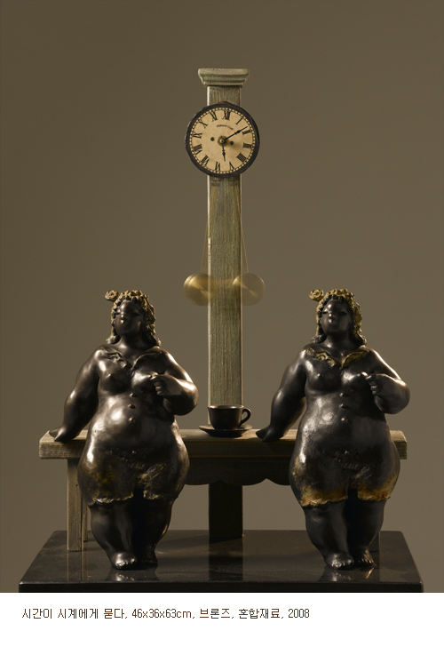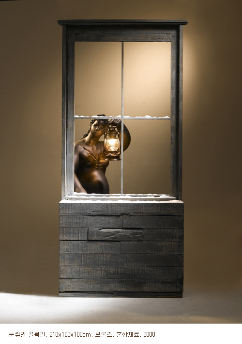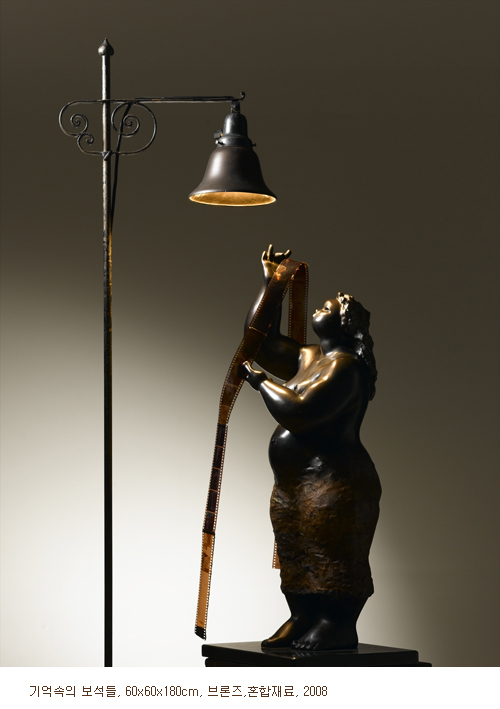 여인이 커다란 거울 앞에 앉아 있는 <누가 이쁠까>나, 여인이 문에 기대서서 독서를 하고 있는 <이야기 속으로>, 또는 여인이 등불을 들고 ‘눈이 쌓인’ 창밖을 내다보는 <눈 오시는 날> 등, 김경옥의 조각은 작가 자신의 일상의 단면들을 보여주는 듯하다. 이러한 상황들은 독서나 노래 또는 전화처럼 성(性) 중립적인 일상들이다.
