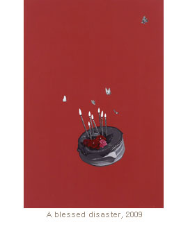 중력이 무시 되는 작가의 화면에는 마치 꿈에서 나올듯한 상황들이 펼쳐진다. 거대한 시계가 수영장에 빠지다가 갑자기 비행기가 그 위를 날기도 하며 그것이 뿌렸을지 모를 양초와 알약이 쏟아져 내린다. 공간을 나뉘는듯한 구획의 경계에서 파도가 시작되기도 한다. 부유하듯 펼쳐진 사물들의 연관성은 어디에도 찾아 볼 수 없다. 작가는 이렇게 서로 다른 공간과 상황이 한 화면에 담겨져 이해 할 수 없을 법한 이미지를 연출한다.