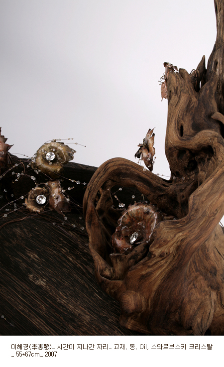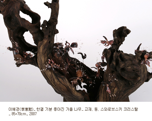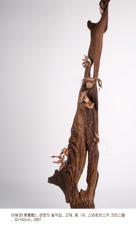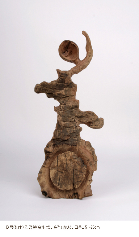 청담동이라고 하는 지역은 대한민국 고급 소비문화의 특색을 극단적으로 보여준다. 특히 갤러리 고동이 위치하고 있는 네이쳐포엠의 경우 현대미술의 보고라고 부를 수 있을 정도로 수많은 갤러리들이 응집하고 있다. 갤러리 고동의 이번 전시는 이러한 부지의 특성과 다양성을 갤러리가 소유하고 있는 미술품이라는 매개체를 통해 다양한 관계의 범주로 대치시키고 있다. 이러한 다양한 관계의 범주는 아이러니하게도 ‘소통’이라는 언어로 묶일 수 있을 것이다. 이번 전시의 작가는 여목 김영철과 이혜경으로, 이 두 작가는 고목을 이용한다는 공통점을 가지고 있다.
