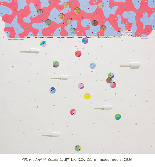 흰색의 질료로 된 두께를 갖고 있는 배경화면은 하찮으면서 가볍고 속이 빈 삶의 실체를 대변하여 최고가 되려는 작가자신에서 자유로운 표현을 허락한다. 그러나 그것은 허무와 절망이 아니라 작은 것에서 그 자체를 받아들이고 그 안에서의 진지함을 깨닫는 것이다. 자신은 물질이 되며 온전히 환원된 세계 속의 하나의 몸에 불과하다는 것을……. 그리고 사물의 온전한 충만한 상태에 대입되면서 생명의 본질에 도달하게 된다. 이렇게 작업을 하는 동안 작가는 세계와 동일한 리듬을 갖고 민감해지고 온몸의 감각이 열리며 전율된다. 그래서 그가 발견하게 되는 물질은 많아지며 주변에서부터 우주의 존재로까지 창조의 영역은 무궁무진하다. 하나님이 창조하신 이 세상의 모든 존재를 알아가는 모든 것과의 소통이 되는 무척 아름다운 과정이다. 김학광은 아주 흥미로운 태도로 모든 것을 관찰하고 재미있어하며 작업 한다. 그것은 보는 이들에게도 전달되어 같은 감흥을 갖게 된다. 사물 하나하나는 작고 보잘 것 없지만 그의 작업에서는 보석이 되고 모여서 세상을 만드는 당당한 존재라는 것을 같이 깨닫게 된다.
