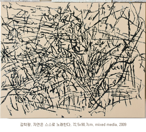 그래서 작품의 구상을 위해 멀리 좋은 풍경을 찾아다닐 필요성을 못 느낀다. 바로 옆에 있는 일상의 쓰레기더미에서도 그 자체의 조형미와 생명을 찾아낸다. 그리고 그것을 자신만의 방식대로 화면에 새롭게 구성한다. 그것을 형상을 만들어 보이기도 하고 추상적으로 표현되기도 한다. 젊은 시절 거대주제로 자신이나 세상을 향해 무언가를 던져놓고자 했던 욕망을 내려놓은 후 자신을 사물에 대입시키면서 사물의 입장이 되어 세상을 표현하는 관조의 관점으로 만들어 내는 작품이다. 김학광은 재료를 다루는 솜씨가 뛰어나 다양한 질감의 화면을 만들어 내고 있다. 물감과 석고, 제이스톤이라는 재료를 섞어 적당히 바탕을 만든 후 약 4시간 정도 경과하면 어느 정도 굳어져 초벌형태를 만들기 시작한다. 형태를 파내고 또 그 속에 나뭇가지나 자연에서 수집된 조각이나 색을 넣고 그 면을 갈고 또 다시 올리고 하는 반복 작업으로 화면은 완성된다. 그의 이런 작업은 먼저 계획되어 진행되면서 우연적이고 즉흥적인 부분도 함께 개입이 된다. 이 것이야말로 우연과 필연이 함께하는 세상의 법칙이 다. 그리고 그의 작품은 바로크를 연상시킨다. 소박한 것에서 화려함까지 다 들어 있는 리듬의 작업이다. 하나의 작은 사물은 그 자체로서의 다듬어진 힘을 가지며 화면 속에서 다른 사물과의 관계를 가지며 하나의 세계를 만들어낸다. 등장된 사물들은 음률처럼 유동적인 형태를 보인다. 작은 형태는 하나의 풀이면서 사람이기도 하다. 그것을 구별 해 나누는 것은 그렇게 큰 의미가 없다. 크게 생성의 법칙에 속한 생명체로서 하나의 풀이나 인간은 다를 바 없기 때문이다. 풀은 겨울에 죽고 봄이 되면 다시 싹이 나고 인간 역시 옛 사람의 매 순간 죽음으로 새로운 영으로 태어나는 성화된 삶을 살아간다.