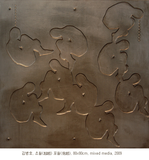 김병호의 작업은 단순한 기호로 되어 있다. 책, 인간, 꽃, 수직으로 뻗은 점을 완전한 형태 혹은 부분적으로 사용해 이 주제를 상징한다. 이 기호들은 가장 평범한 비율로 감정이 섞이지 않은 솔직한 일정한 두께의 선으로 그린다. 그리고 반투명 트레팔지에서 완벽한 선으로 준비되어 나무판으로 된 화면으로 옮겨진다. 가장 평범한 형태를 가장 완벽하게 준비하는 것이다. 이것이 그가 늘 생각하는 “초월”과 “포월”의 개념이다. 단순하고 평범함에서 가장 아름답고 영성이 가득한 정신세계를 담아내는 것이다. 그것은 서로 멀리 떨어져 있지 않다. 한 화면에서 사람은 구부리고 앉아 있거나 서서 걸어 다니는 형태가 연속으로 등장한다. 그것은 시간을 말하는 것이다. 이미 바탕화면에 음각으로서 파놓으면서 예비 된 구원된 자로서의 선택된 존재를 담아낸다. 그리고 말씀을 지키며 늘 기도하는 행위를 삶에서 실천하며 나오는 절제된 선과 기다림의 산화되는 납에서 두 번째 구원이 이루어지기를 바란다. 세 번째는 작업의 결과물을 통해 결국 하나님으로의 구원으로 연결되기를 원한다. 이것이 평범한 실존의 인간으로부터 나온 주제 “초월”과 “포월”이다. 그의 실루엣으로 된 각 형태는 그들의 본질을 말하고 있으며 서로 다른 정체성을 갖고 있다. 김병호의 작업은 참 경건하다. 특별하거나 과장된 감정적 상태가 아닌 단순한 선으로 나를 가다듬으며 하늘과 닿아 있고자 하는 행위의 실천적 작업이다. 납이란 문명의 상징 속에 둘러싸인 인간의 환경이지만 자신을 깊게 다듬고 내면의 영성을 가꾸는 것이란 본질이야말로 늘 하나님과 하는 평안한 삶을 영위하는 것이다.