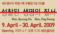 세오갤러리의 4월 전시는, 부활절을 기념하기 위해 2인의 중진 기독 작가를 초대해 마련한 “성찰된 생명의 질서”이다. 젊은 날에는 질료와 예술의 거대목적을 위해 실험하였고 이제는 현 위치의 자신으로부터 삶과 예술이 같이 경험되고 있는 작업을 보여주는 김병호와 김학광의 개인전 형식의 2인展으로 꾸몄다.