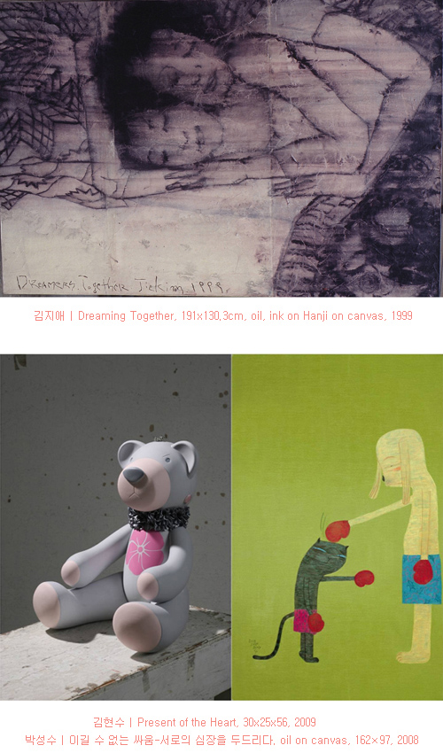 김지애는 그녀의 초기작 시리즈 중 시리즈와 를 선보인다.이 시리즈는 기름먹인 한지 위에 오일페인팅으로 그리는 김지애의 독특한 기법이 처음으로 등장하는 시기의 작품들이기도 하다. 그녀는 그 누구도 한번쯤은 열병처럼 겪었을 행복한 연인들의 키스와 포옹, 행복의 표정으로 사랑의 풍성한 기억들을 보여준다. 박성수는 고양이나 개를 의인화하여 사랑에 대한 완곡한 표현을 시도한다. 커다란 깔대기로 ‘Love You’라고 외치거나, 서로 이길 수 없는 싸움(사랑싸움)을 하는 등, 그들의 다양한 표정과 액션으로 사랑을 효과적으로 전달한다.
