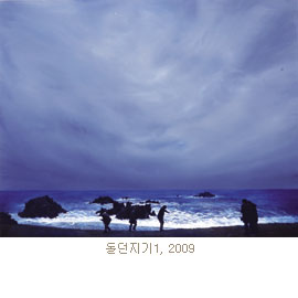 그간 한밤의 개, 근교 풍경, 근린자연 등을 다루어 오던 공성훈 작가는 이번 전시에서 겨울 풍경을 그렸습니다. “오리(120호)”는 달빛이 살얼음이 언 호수 표면을 비치고 그 얼마 남지 않은 물에 오리들이 갇혀 버둥거리고 있는, 어찌 보면 은유가 가득 담긴, 그러나 순수한 풍경으로도 볼 수 있는 작품입니다. 또한 바닷가에 파도가 부서지는 바위에 어린 아이가 고립되어 있으며 어둡고 음산한 하늘이 버티고 선 “파도 앞의 아이(80호)”등 작가의 탁월한 묘사력에 눈을 떼기 어려운 수작들이 나옵니다. 절벽위의 소나무(20호), 달과 새(50호), 등 지극히 아름다운 풍경인데도 꼭 무슨 일이 일어날 것 만 같은 느낌을 갖게 합니다.