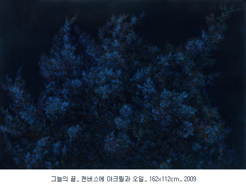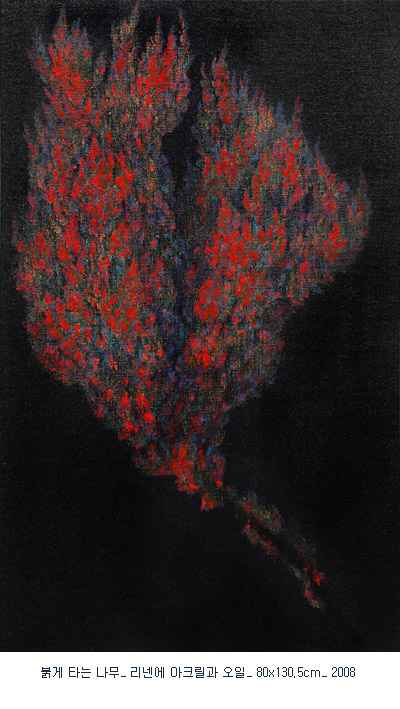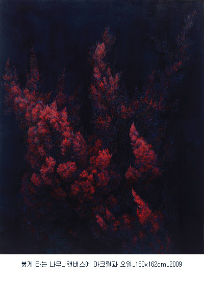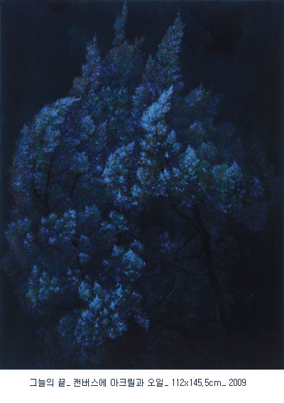 세오갤러리가 선정한 2009년 두 번째 영 아티스트는, 그늘 안에서 스스로 빛을 내뿜고 있는 측백나무 시리즈로 진지한 조형실험을 하고 있는 안중경의 회화 “빛의 정점“展입니다. 서울대 서양화과를 졸업하고 오랜 시간 전업 작가로 자신의 조형세계에 대한 깊이 있는 탐구를 하고 있는 안중경은, 빛이 없는 공간에서 마치 기(氣)가 어린 듯 나무 자체에서 발광(發光)이 일어나고 있는 측백나무 시리즈를 선보입니다.