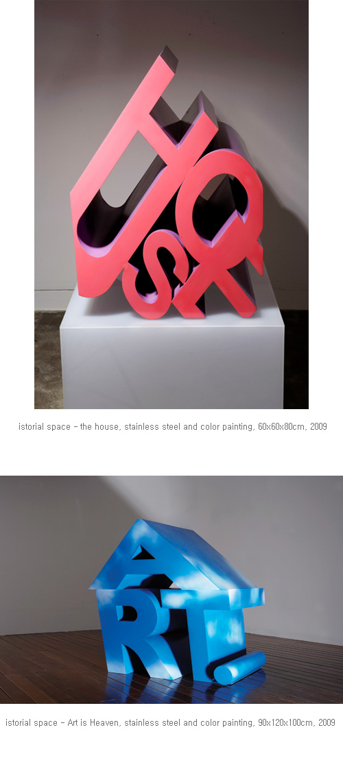 는 ART라는 알파벳 문자 형상이 모여져 집이 된다. 이전의 작품들이 이미지가 전달됨으로 상상으로서 천천히 전환되는 감각이었다면 이 작업은 기호가 전달되면서 주는 즉각적인 소통과 이미지의 상징으로 지적인 조각을 보여주고자 한다.