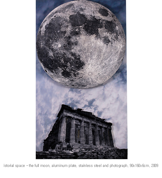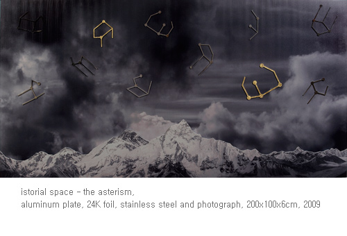 캔버스 틀을 연상하는 스텐레스 스틸로 된 평면에 제주도고향에서 찍은 하늘과 바다의 사진 컷이 인화되고 자연과 우주의 극적요소로서 달, 산이 등장되며, 파르테논 신전의 현재 모습이나 날개가 있는 집이 조각적 요소로서 함께 조합되어 전혀 다른 시공간의 파편들끼리 공존된 새로운 공간이 만들어 진다.