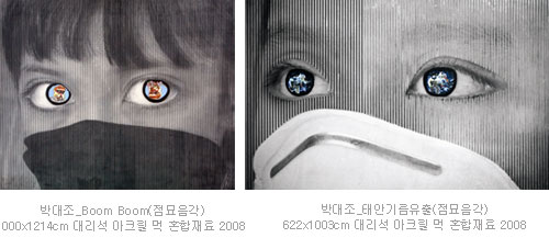 投影, Too Young 전에 부쳐投影, Too Young 전은 박대조, 조덕환 두 작가의 세상바라보기이다. 그들의 중심에는 아주 작고 어린 아이들이 존재한다. 박대조는 아이의 이미지를 포토샵을 통해 인위적으로 눈을 키워내고 아이의 큰 눈속에 전쟁, 테러와 같은 어른들의 이데올리기적인 세상을 담아내고 있다. 이 서정성이 높은 강열한 아이의 눈빛은 박대조의 조형의 핵심을 이룬다. ‘눈을 크게 하기’는 ‘세상을 모두 바라보기’로 정의할 수 있다. 이는 천안통(天眼通)으로 천가지 세상의 모든 멀고 가까운 고락의 모양을 밝혀 내다볼 수 있는 자유자재(自由自在)한 힘이라 할 수 있다. 이러한 순진무구한 아이의 종교적 세상의 관조는 인류가 만들어낸 가장 비극적인 형상을 새겨 넣음으로써 내용의 극적인 대비를 이룬다. 이것은 지구 곳곳에서 일어나는 고통, 슬픔, 아픔 등과 같은 인류의 이기적 사건들이 이루어내는 인간의 역사를 어린이, 동심이라는 우리들의 원시적 순수함으로의 회귀로 비유될 수 있는 주제를 표현함으로써, 태초의 에덴 동산과 같은 ‘화해’와 ‘순수’를 되찾기 위한 작가가 제시하는 치유적 방편이라 하겠다.