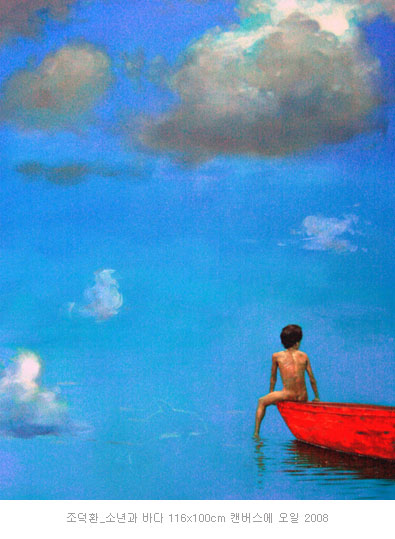 우리는 정지해 있듯이 그 빠름을 모르는 것처럼 그가 만들어낸 화면속의 아이들은 정지해 있다. 그들이 존재하는 곳엔 존재와 존재사이를 연결하는 매개물들이 형상화 된다. 대기를 바라는 배를 탄 아이, 요술모자를 쓴 아이, 놀이를 하는 아이 등 관계속에서 존재하고 있음을 알 수 있다. 생택쥐페리의 어린왕자에서 관계를 맺는다는 것은 길들이는 것이라는 여우와 어린왕자의 대화처럼 그 길들이기는 관계 사이에 유, 무의 거미줄과 같이 얽혀진 연결고리들 속에서 깊은 관심과 따뜻한 사랑으로 이루어진 관계를 말한다. 작가가 그려내는 푸른 색조는 바다, 하늘이 만들어내는 푸르른 색처럼 매우 자기성찰적인 색이라 할 수 있다. 어쩌면 작가는 어른들의 삶을 동심의 아이들을 등장시켜 은유하고 있는지도 모르겠다. 작가의 화면이 고요하게 그리고 낯설게 다가오지만 영겁의 시간을 내포한 맑은 아이들을 통해 가슴속에 깊숙이 숨겨두었던 잊었던 뭉클한 사랑을 건져 올리고 있다 할 것이다.