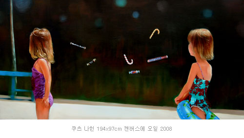 나는 아이들을 그린다. 아이들은 새로운 세계로 들어가는 문이면서 현실과 미래, 시간과 공간을 연결하는 다리가 될 수 있다. 여행에서 만난 아이들과 우리의 어린 시절의 모습에 현재의 나를 투영한다. 어느 햇살 좋은 날 놀이터에서 주위에는 아이들이 뛰어 놀고 있었고 여느 때와 같은 평범한 놀이터 풍경이었다. 갑자기 시간이 멈춘 듯 아이들의 동작하나 하나가 마치 슬로우 모션과 같이 느껴졌고 동작과 동작 사이는 점과 점을 잇는 드로잉과 같은 느낌이었다. 후에 러시아 형식주의 학자 쉬클로브스키가 말한 ‘낯설게하기’와 비슷한 경험이라는 생각이 들었다. 쿠츠 나힌(kutz nahin)은 ‘아무것도’ 란 힌디어이며 류 시화의 글에서 인용한 말이다. 아무것도, 있다와 없다 사이의 가능한 수많은 상징들은 아이들 주변을 부유(浮遊)한다. 인도 여행에서 만난 금발아이들은 호수와 해변이 만나는 곳에서 <이상한 나라의 앨리스>의 토끼처럼 갑자기 나타났다가 사라졌다. 나는 마치 꿈을 꾼듯한 느낌이었고 그 찰나의 순간을 <쿠츠 나힌>을 통해 기억해낸다. 자연과 아이들은 신이 주신 선물이다. 인간이 창조할 수 없는 것들, 그러므로 위대하다. 자연과 아이들의 만남은 기적과 같다. 아이와 물고기 사이에는 분명 유리벽이 있지만 회화에서는 블루라는 공간에서 하나가 된다. ■