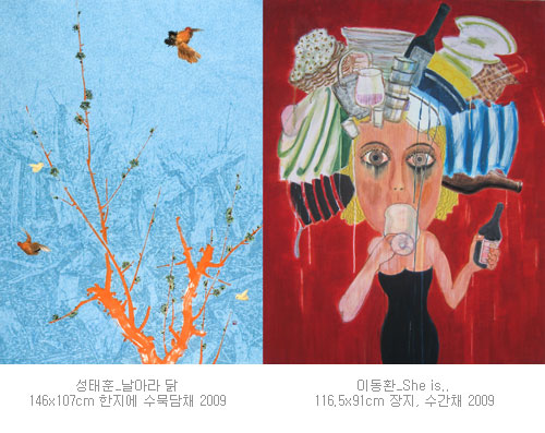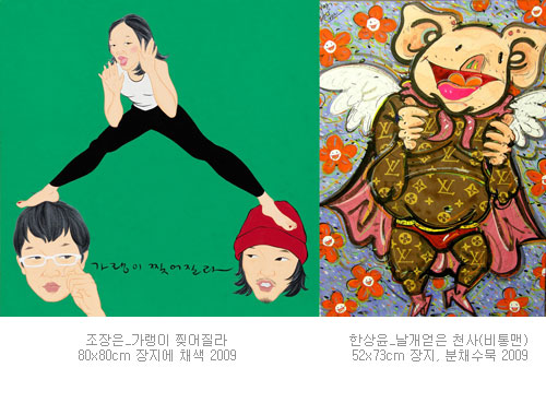 <그림일기> 시리즈를 통해 작가의 정체성을 찾아가는 조장은 작가의 작품은 너무 솔직하다. 전통 초상화에서의 단백한 화면구성과 어린 시절 즐겨 쓴 그림일기와 문인화처럼 글자가 한 화면에 구성된다. 그의 작품은 보는 순간 시원하게 웃게 한다. 그리고 시나브로 관람자가 자신의 모습을 보는 거울역할을 한다. 가령 <피가 거꾸로 솟는다>는 고운 분채로 여러 번 채색한 핑크 빛 바탕에 거꾸로 된 젊은 여성의 하반신은 직설적인 표현방식이 군더더기 없이 위트있게 다가오고, <죽쒀서 개줬다>는 붉은 바탕에 사람의 머리는 개로, 냄비 속에는 사람의 얼굴이 그려져 있어 단어에서 오는 뉘앙스를 과감하게 표현하여 작가의 거침없는 감성이 타자와의 소통의 힘을 발휘한다.