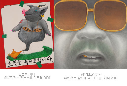 ‘낯설게 하기 효과’를 적극 도입하여 상상의 에너지를 거침없이 뿜어내고 있는 임성희 작가이다. 전위법을 구사하고 있는 <춤추는 샘>, <욕조는 바다다>에서 크기의 변화 즉, 욕조와 변기가 재치있고 풍자적이다. <복날>, <지니>에는 돼지가 등장한다. 긍정적인 측면에는 복을 주는 돼지와 부정적인 측면에는 살찌고 둔한 사람을 빗댄 돼지에 대한 일반적인 개념을 기본으로 하지만 그 표현방식은 기발하다. 하늘을 나는 돼지들, 변기에서 수영을 하고 춤을 추는 사람들은 반복된 현실에서의 탈피를 꿈꾸는 일반인들에게 이탈의 즐거움을 안겨 준다. 작품마다 적합하게 표현된 초록색 잔디는 자연을 상징하는 오브제 역할을 한다. 작가의 넘치는 상상의 에너지가 공간이동의 즐거움 또한 안겨준다.