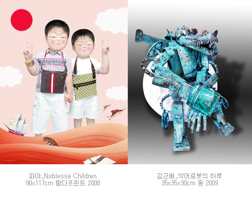 김근배 작가는 서사성이 돋보이는 조각 작품을 출품하였다. 재료는 주로 대리석, 동, 스텐 등을 사용한다. 작품 제목 <돼순아, 학교가자>, <악어의 하루>, <토끼로봇의 여정> 등에서 유추해 볼 수 있듯이 친밀하고 우화적 내용으로 전개하고 있다. <돼순아, 학교가자>에서는 도시락을 싣고 걷는 돼지의 풍자성이 숟가락 형상의 꼬리에서 폭소를 자아내게 한다. <악어로봇의 하루>는 인간과 동물, 그리고 로봇이 결합된 형태이다. 작가의 풍부한 상상이 농축된 이질적 조형작품을 통해 예기치 않는 미적 체험을 유도한다. 넓은 범주에서 해학적이고, 기계문화의 발전에 의해 변질하는 인간과 자연에 대한 의미로서는 풍자적이다.