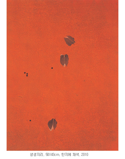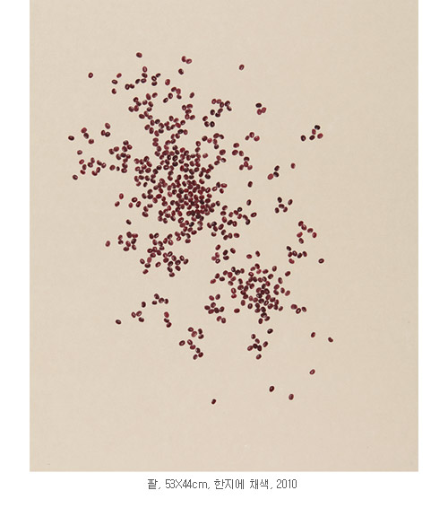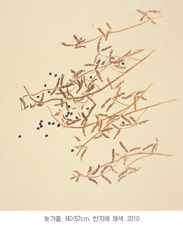 재작년 늦가을 서울 근교로 스케치를 다녀왔다. 맑은 가을 들판은 제각기 색깔과 모양이 아름다웠다. 오후 바짝 마른 잡풀들을 밟는 순간 바삭거리는 소리와 함께 여러 들풀들의 씨앗들이 튀겨나갔다. 자세히 보니 짙은 갈색과 붉고 다양한 씨들이 앞 다투어 터트려지고 있었다. 그 소리들은 지금도 생생하게 기억된다 이는 마치 동양화 화선지 위에 긴 호흡을 한 후 필연적인 점들을 찍는 것 같았다. 퍼져가는 공간의 선과 점이며 시점이었다.