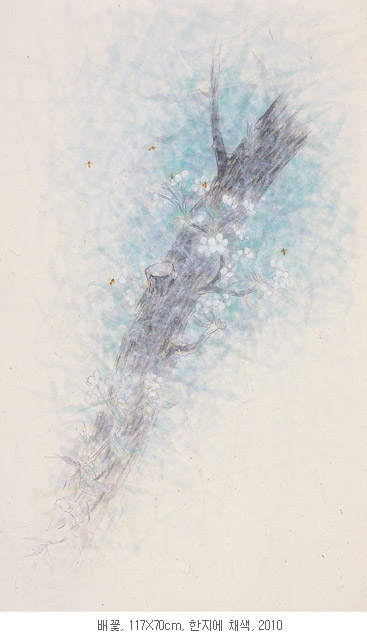 채색화 특유의 장식적 화려함이나 특별한 기교적인 발휘도 배제한 채 그저 담담하게 사물들을 바라보고 표현하는 그의 화면은 어쩌면 그려진 사물들을 응시하는 것이 아니라 오히려 그려지지 않은 여백들을 지향하는 것인지도 모른다. 그의 여백은 비어 있다. 그것은 비어있음으로 더욱 충만해지는 그런 공간이 아니라, 그 자체가 적막하고 쓸쓸한 감성과 정서를 드러내는 것이다. 그는 그리지 않음을 통해 그려진 것 이외의 것을 이야기하고자 하며, 보이는 것 너머에 있는 또 다른 감성을 표출하고자 한다.