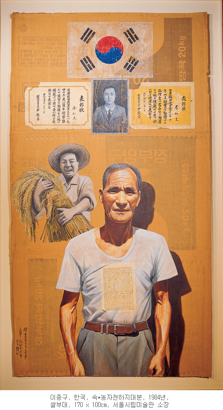 - 이종구는 충남 서산시 오지리에서 태어나 중앙대학교 회화과를 졸업하고 1980년대 초반부터 민중미술운동애 참여했다. 고향 오지리에서 농부로 생활하는 작가의 아버지를 소재로 한 이 작품은, “풍요로운 농부”의 선전적인 이미지들과 대비를 이루면서, 늙고 힘들고 고통에 찬 “실제” 농부의 모습을 보여준다. 쌀부대 종이를 그대로 활용하여, 그 위에 매우 사실적인 기법으로 초상을 그리고, 농업을 권장했던 국가로부터 아버지가 받은 상장들, 힘든 일상을 진솔하게 담은 아버지의 편지 등을 콜라주 했다. 작가는 이상화된 농촌의 이미지와 실재하는 농촌의 현실이 지니는 괴리에 대해 지적하면서, 관객으로 하여금 ‘리얼리티”에 대한 인식 자체를 재고하도록 이끈다.