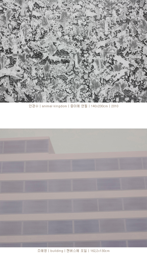 _ critic 강홍구(작가) + artist 안경수(작가) 안경수는 오래된 기억 속의 수집물에서 출발한 이미지들을 상상속의 풍경들과 뒤섞어서 새로운 내러티브의 드로잉으로 재편집한다. 기억속의 정물 이미지들을 수집/편집하고 그것들을 다시 화면 속에서 재배치하며 새로운 내러티브를 만들고, 이 이미지를 인쇄한다. 이 인쇄된 이미지들은 먹지를 이용해서 종이 위에 전사하고, 마지막으로 다시 연필 드로잉으로 마무리 한다. 작가는 이러한 단계를 통해 형상화된 풍경이 상징적, 목적적, 생산적 상상을 통해 이루지는 드로잉이라 이야기 한다. 그의 작품은 하나의 화면에서 실제와 가상이 부자연스럽고 혼잡스러운 구성으로 조합되지만, 오히려 현실과 내밀하게 닮아 있는 상징적 풍경이다.