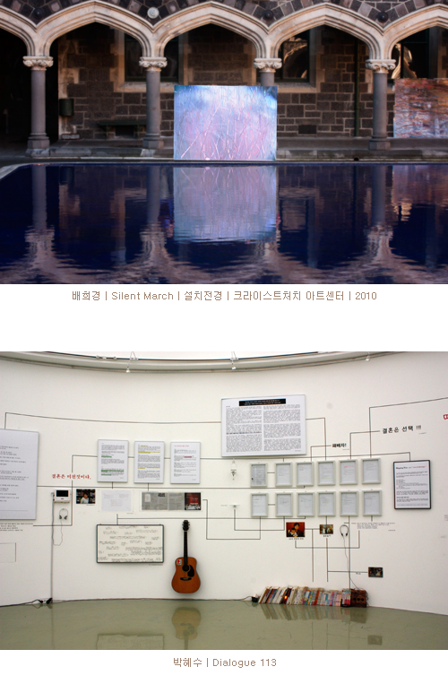 _ critic 민정기(작가) + artist 배희경(작가) 배희경의 작업은 작가가 체류했던 지역들의 이미지들을 유트브로 촬영하거나 인터넷 화상통화로 만나는 인물들을 촬영한 디지털 이미지들에서 시작한다. 작가는 이렇게 출력된 이미지들 위에 물감을 뿌리고 이를 다시 말리고 벗겨내는 행위를 통해서 이들을 추상의 이미지들로 전환시켜간다. 뿌리고 말리고 벗기고 그리는 반복적 행위를 통해서 물리적 장소와 구체적인 인물들은 추상의 이미지들과 중첩된다. 이러한 중첩을 통해서 작가는 자신의 정체성과 사회성을 기록함과 동시에 또 다른 문화와 이를 넘어 무한의 시간과 공간을 중첩시킨다고 본다.