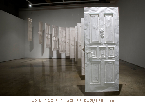 _ critic 정종미(작가) + artist 송영욱(작가) 송영욱은 유년시절이나 특정한 추억 등 자신에게 기억을 불러일으키는 대상을 종이로 떠내고, 이 종이로 캐스팅된 오브제들을 설치하는 작업들을 선보여왔다. 특정한 물건을 캐스팅을 통해 재현하기보다는 그러한 캐스팅 껍질들을 결집하여 하나의 공간을 만들어낸다. 이러한 껍질들은 완결된 형태로 독립적으로 설치되기 보다는 공중에 매달리기도 하고 부서진 형태로 바닥에 놓이기도 한다. 작가는 이러한 작업을 통해서 기억에 대한 감정이 고조됨과 동시에 외로움이나 공허함에 대한 이야기들을 전달한다.