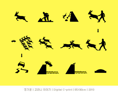 - critic 이건용(작가) + artist 정기훈(작가) 정기훈 작업은 연출된 사진과 신체 행동의 매뉴얼을 도식화해서 보여주는 드로잉과 영상 등 다양한 매체들로 구성된다. 도시 안에서 흔히 접할 수 있는 공공 시설물들-교통 바리케이트, 횡단보도, 주차금지봉 등-에 대한 독특한 해석이나 상상의 동물 유니콘으로 분한 굴삭기를 통해서 현대사회에 대한 풍자를 드러내는 작업들을 선보여왔다. 관객들은 작가만의 독특한 유머 뒤에 숨겨진 씁쓸한 현실과 우리의 모습에서 유쾌하지만 그저 웃을 수만은 없는 상황을 마주하게 된다.