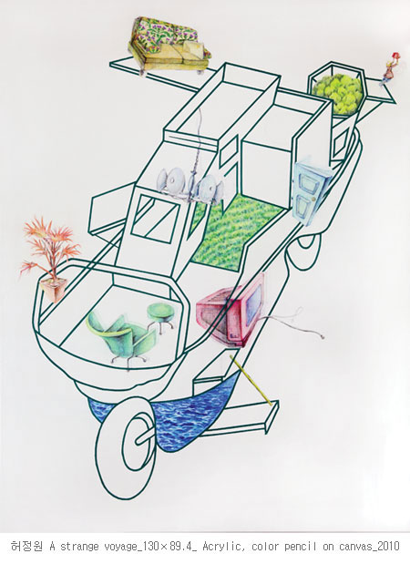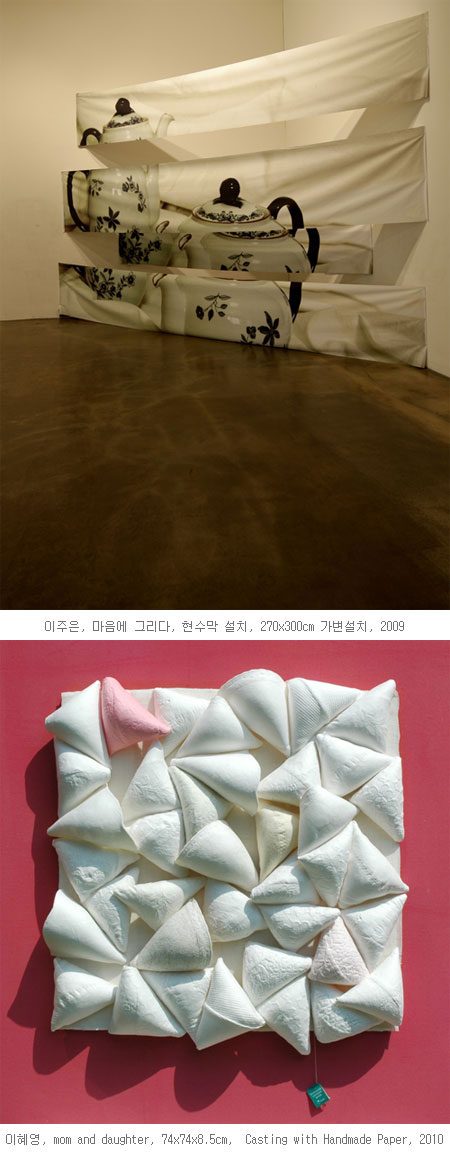 송영욱의 작업은 “기억”이란 단어에서 출발을 한다. 한지로 떠낸 그의 기억 속 일상의 물체들은 한지를 붙이고 떼내고 결합하여 기억의 껍질이 된다. 껍질들은 공중에 매달거나 부서진 형태로 기억의 공간을 만들고 추억하게 한다. 안세은은 일상에서 반복적으로 소비되는 사물, 상품에 주목한다. 우리의 일상은 그것과 함께 일회적으로 소모되고 반복된다. 가볍고 일회적으로 소모되는 현대, 현대인의 삶을 은유 하는 것으로 설치와 페인팅으로 작업한다. 이주은의 현수막 작업은 일상의 사물이 각기 지닌 기능을 충실히 이행하고 있는지에 관심을 갖고 공간을 뒤바꾸는 시도를 보여준다. 사물의 중심에서 일상의 사이를 바라보며 낯설음과 경이로운 풍경을 만나게 안내해 준다. 이혜영은 자신과 가족의 옷, 기물 등 일상의 흔적을 종이를 이용하여 떠내는 작업을 한다. 기물에서 떠낸 석고 틀에 젖은 상태의 종이를 겹겹 붙이며 두드리고 건조하여 일상의 요철을 간직한 단단한 종이부조가 된다. 노동이 명상이 되는 순간이다. 임선희는 영화나 뉴스, 드라마, 소비재, 기호품 등의 대중 문화적 도상들로 가득 찬 세상 속에 숨어 있는 나를 찾는 작업을 다양하게 보여준다. 현실과 상상의 경계를 넘나드는 TV 드라마를 모티브로 페인팅 작업을 선보인다. 정희경은 일상의 기물들과 자연을 메조틴트 기법으로 표현한다. 메조틴트는 다른 판화와는 달리 어두움에서 출발한다. 모든 사물이 모습을 드러내는 근원이 되는 그 풍요한 어두움이 독특한 관조의 세계로 관객을 이끈다. 허정원은 일상공간 속에서의 추출한 기억과 기록, 흔적, 공간 등을 관조하는 눈으로 내려다보는 시점으로 풀어 나간다. 독특한 시점의 드로잉들과 때론 쳇바퀴 도는 일상의 무심한 반복을 재미있는 장난감 같은 설치로 풀어 보여주기도 한다.